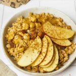 Empfohlene Kombination: Wir haben das APFEL-ZIMT-PORRIDGE mit unserem 100%igen Pekannussmus, weiteren Sultaninen, einigen frischen Apfelscheiben und Sonnenblumenkernen garniert.