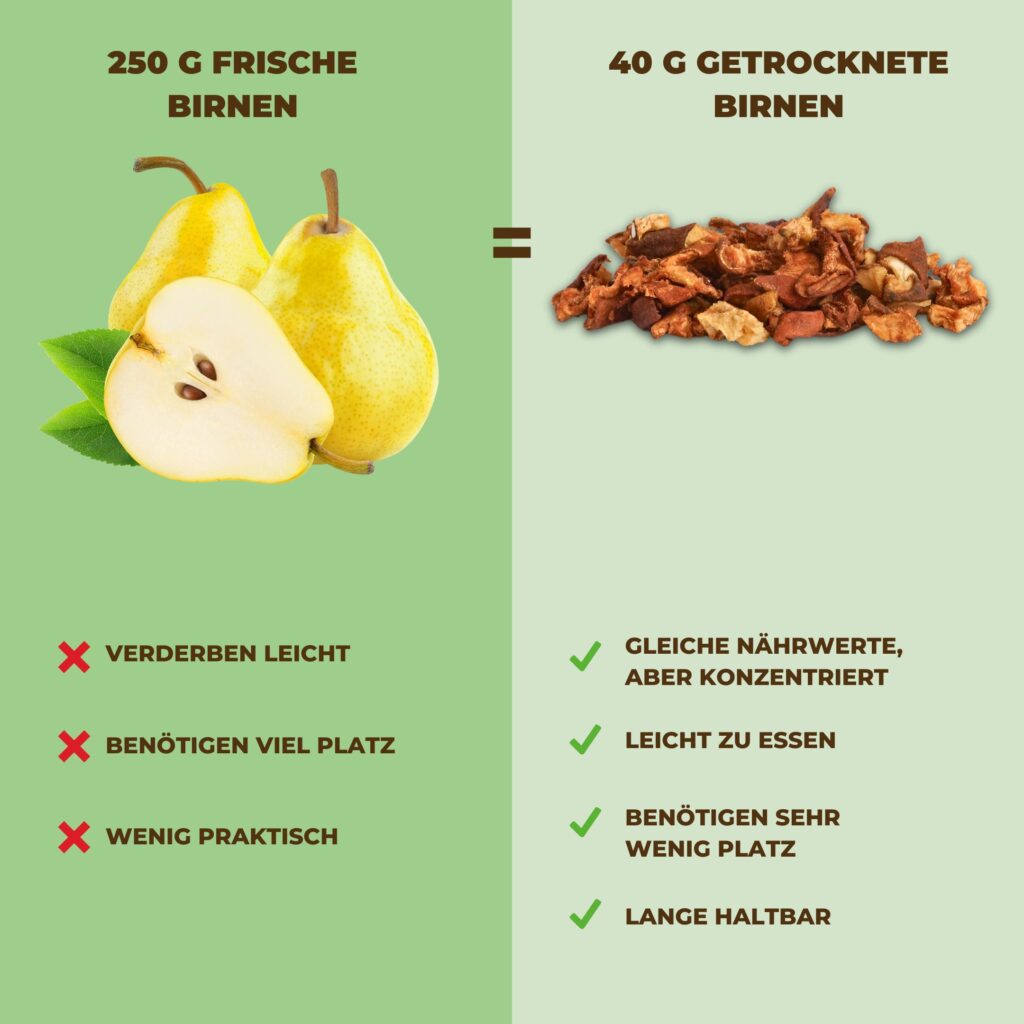 Kennst du die getrockneten Birnen aus dem Supermarkt? Vergiss sie: Unser Trocknungsverfahren ist schonend, das heißt, wir trocknen bei niedrigen Temperaturen und vor allem ohne Zuckerzusatz.