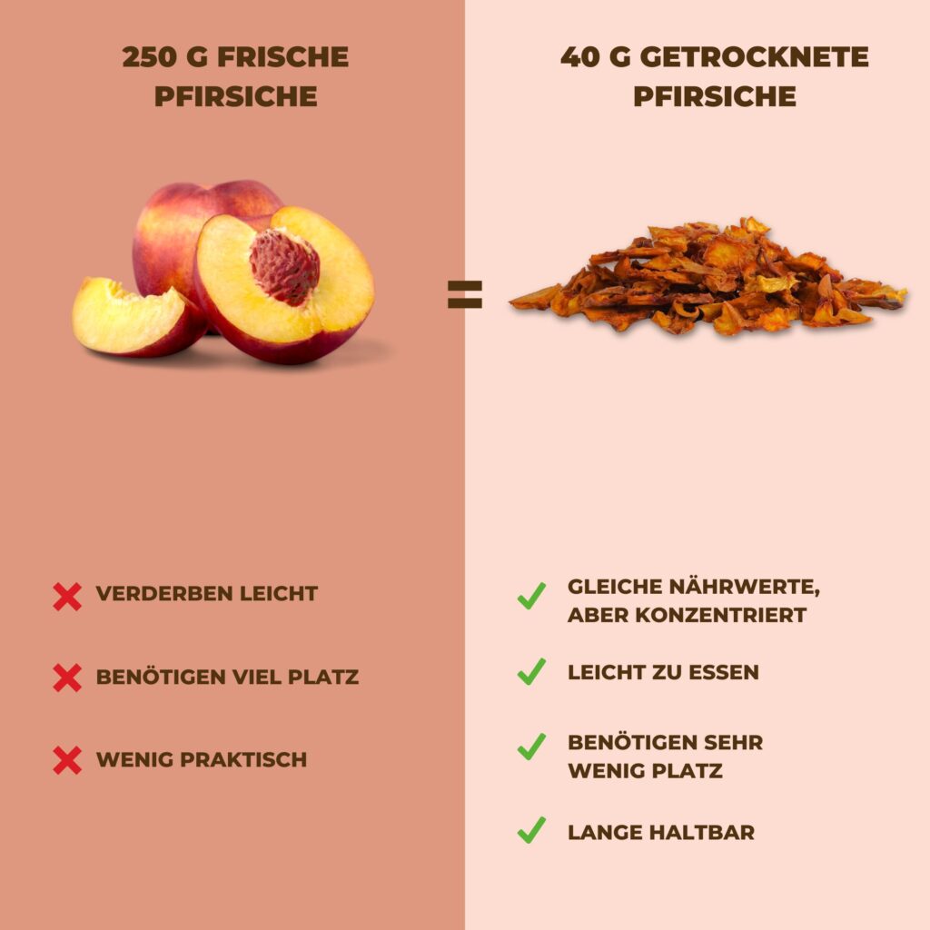 Die Pfirsiche werden in Würfel geschnitten und mit der Haut getrocknet. Das macht ihren Geschmack noch ausgeprägter und nicht zu süß. Deshalb lassen sie sich perfekt mit süßeren Früchten wie Sultaninen oder Melone kombinieren!