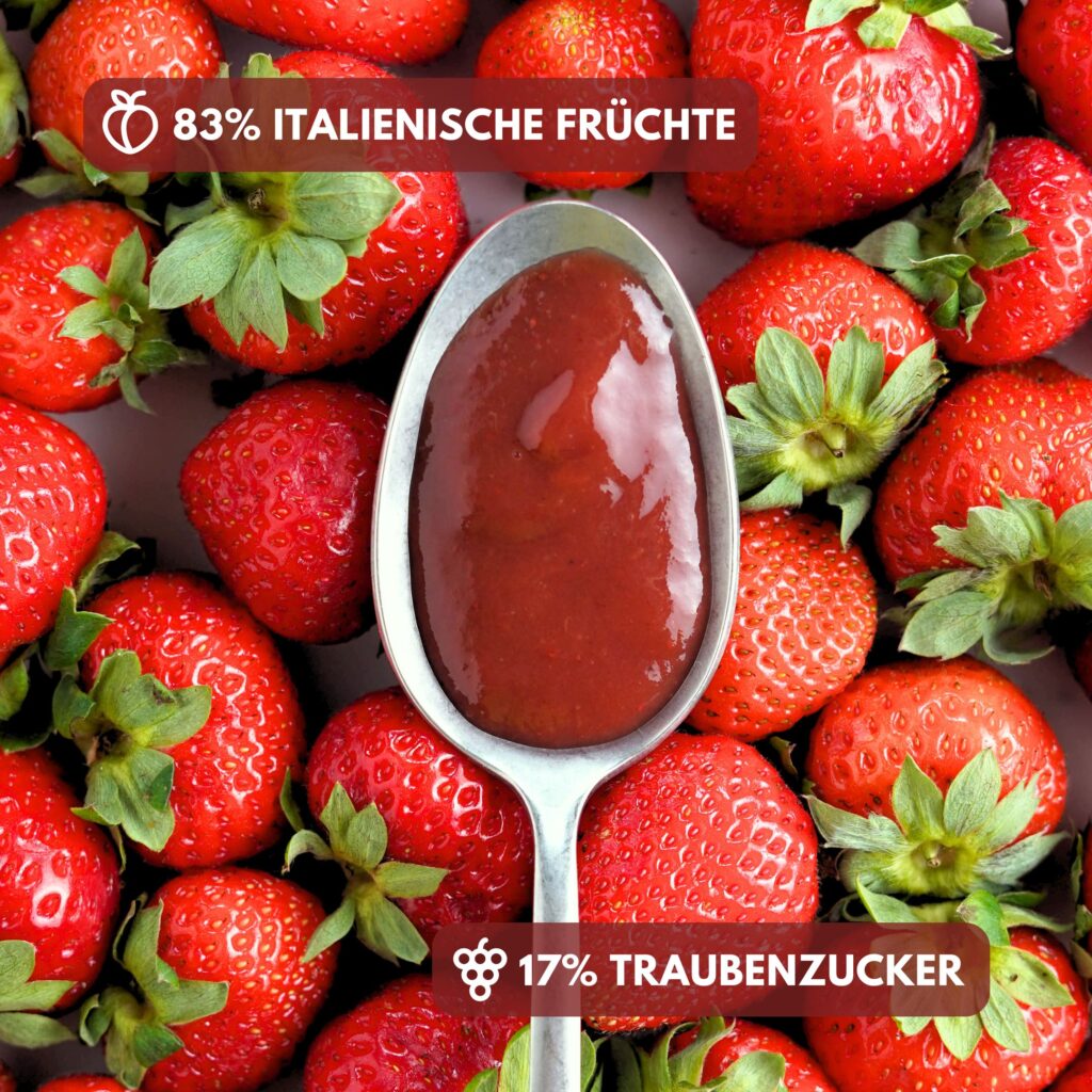 100% FRUCHT: 83% Erdbeeren + 17% Traubenzucker. Keine Konservierungsstoffe, keine Zusatzstoffe.