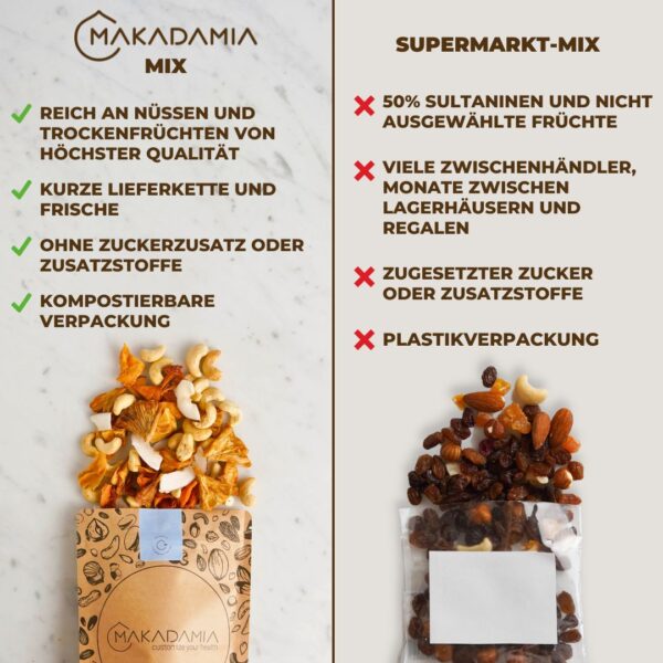 Zutaten: Walnüsse, naturbelassene Pekannüsse, Macadamia-Nüsse, Sultaninen