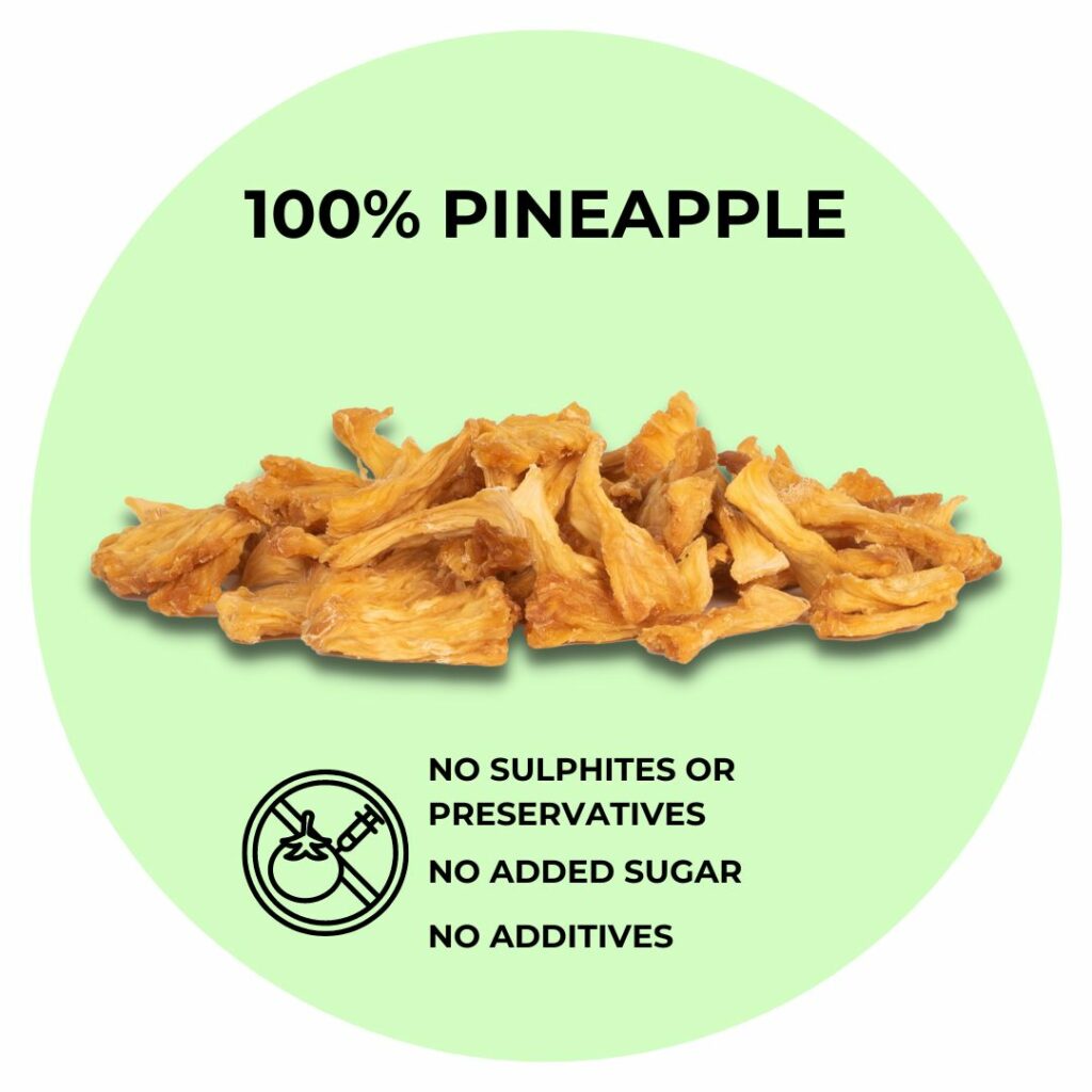 Our pineapple comes directly from Ghana and is dehydrated as soon as it has reached the right degree of ripeness. At that point the fruit does not need any additives or preservatives, 100% Pineapple. In our Pineapple you will only find Pineapple. 🙂