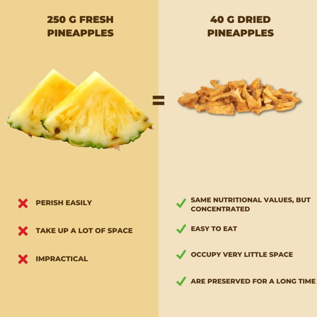 The taste is indeed very similar to that of a fresh pineapple, but more concentrated and its texture is very soft. The sensation is a bit like eating a candy, but all natural and with no added sugar.
