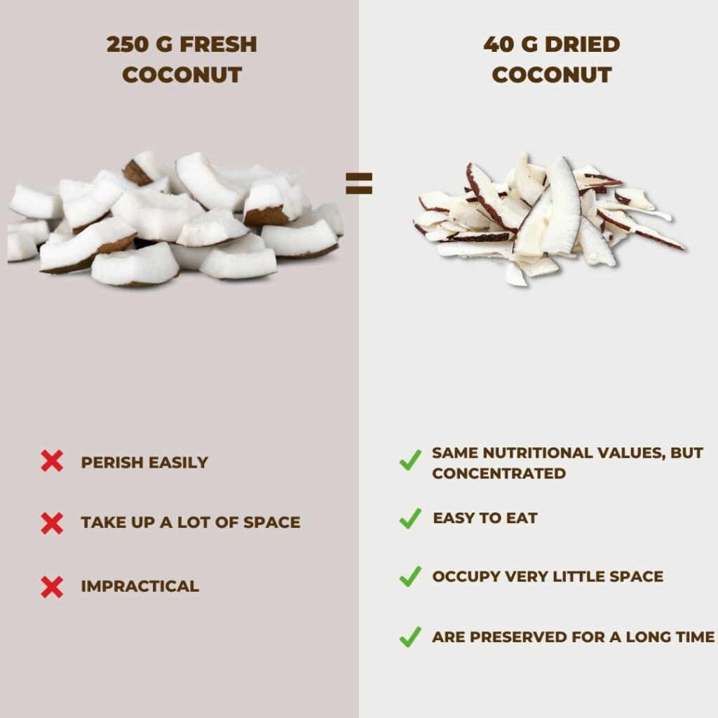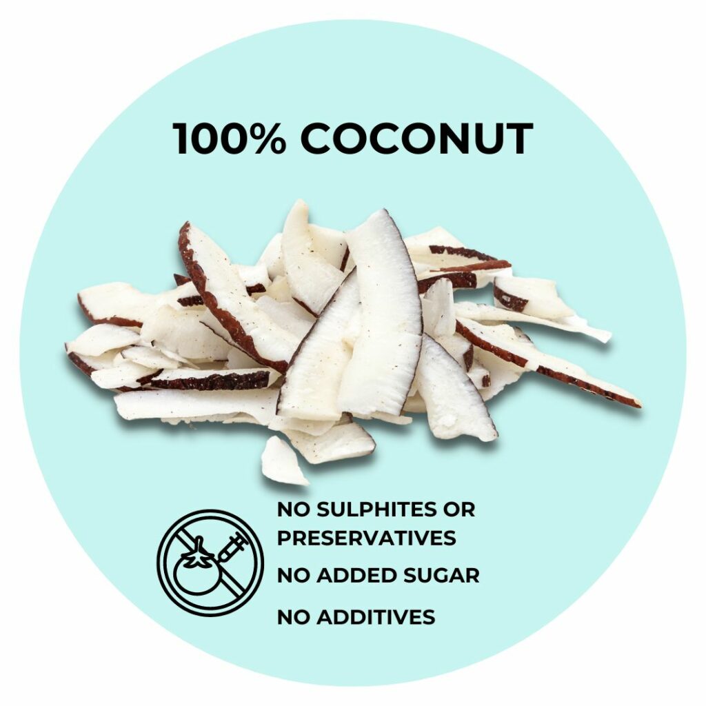 Our Coconut flakes are free of additives or preservatives of any kind. 100% Coconut, nothing else. With every bite only an explosion of freshness and crunchiness.