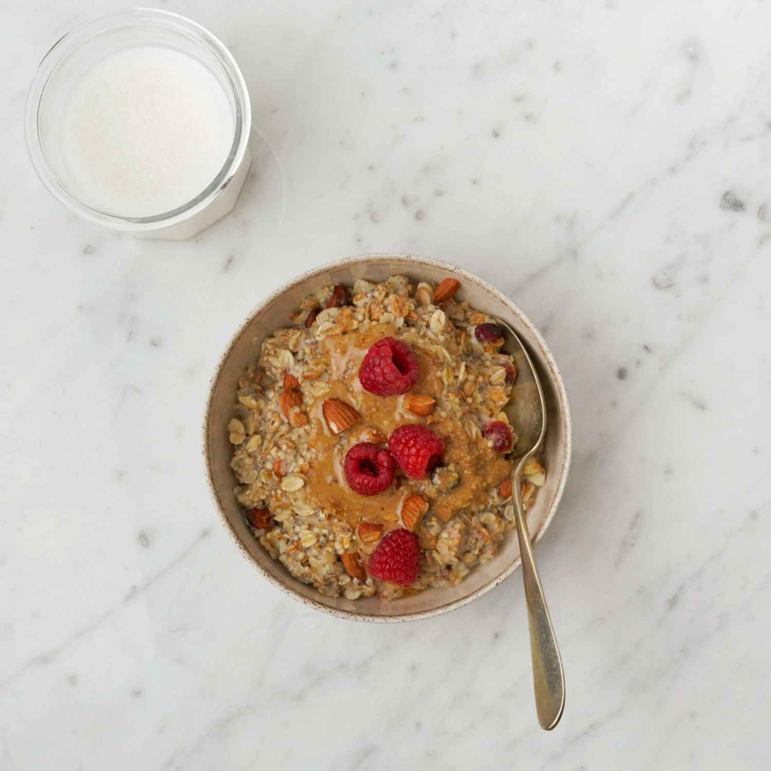 Abbinamento consigliato: noi, L’ALMOND-BERRIES PORRIDGE lo abbiamo guarnito con la nostra Crema 100% Mandorle, mandorle spezzettate e lamponi freschi.