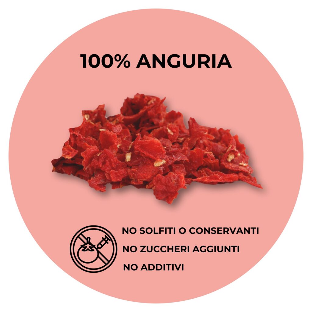 La vera magia avviene durante il processo di essiccazione: la resa è del 3/4% perché con 1 kg di anguria fresca riusciamo ad ottenere solo 40 g di prodotto essiccato, condensando tutto il sapore e i benefici nutrizionali di un’anguria intera in una manciata di pura dolcezza.