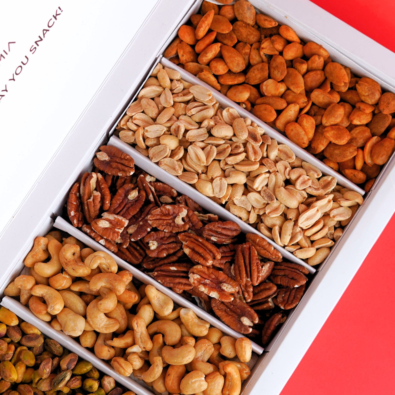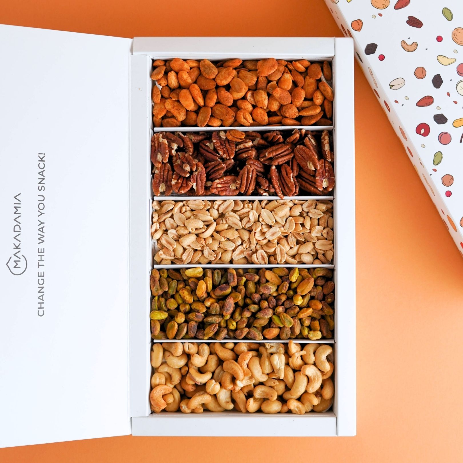 In questa box da 750 g troverai Pistacchi tostati, Arachidi tostate, Anacardi tostati, Noci pecan tostate e Mandorle alla paprika.