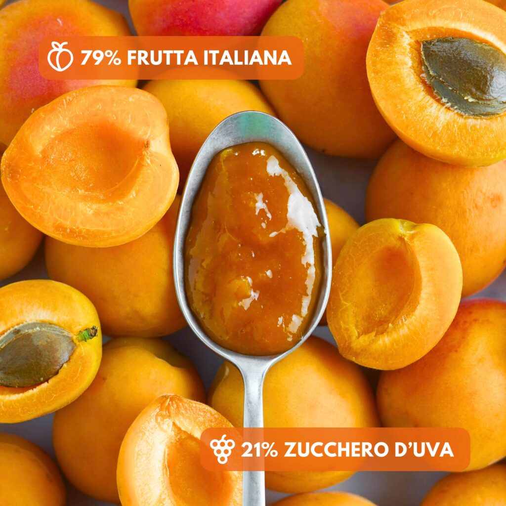 100% FRUTTA: 79% albicocche + 21% zucchero d’uva. 0 conservanti, 0 additivi.