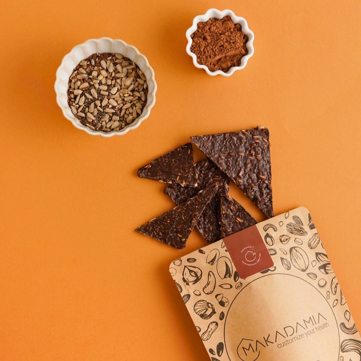 Un incredibile mix di semi avvolti da Cioccolato Fondente al 60% e un pizzico di sale marino che regala un connubio di sapori indescrivibile.