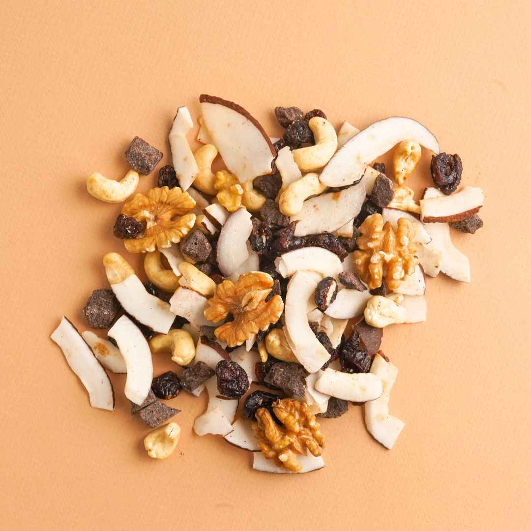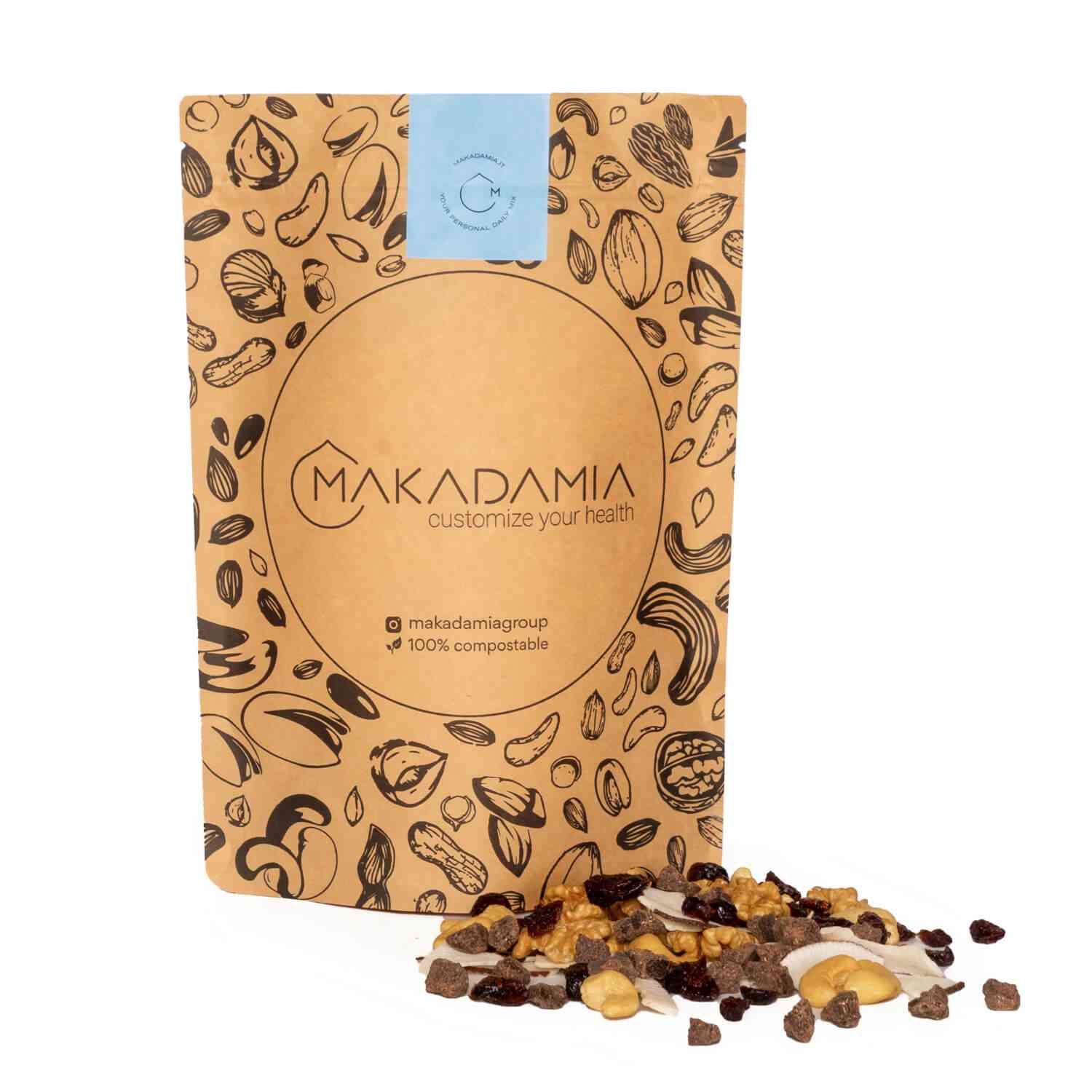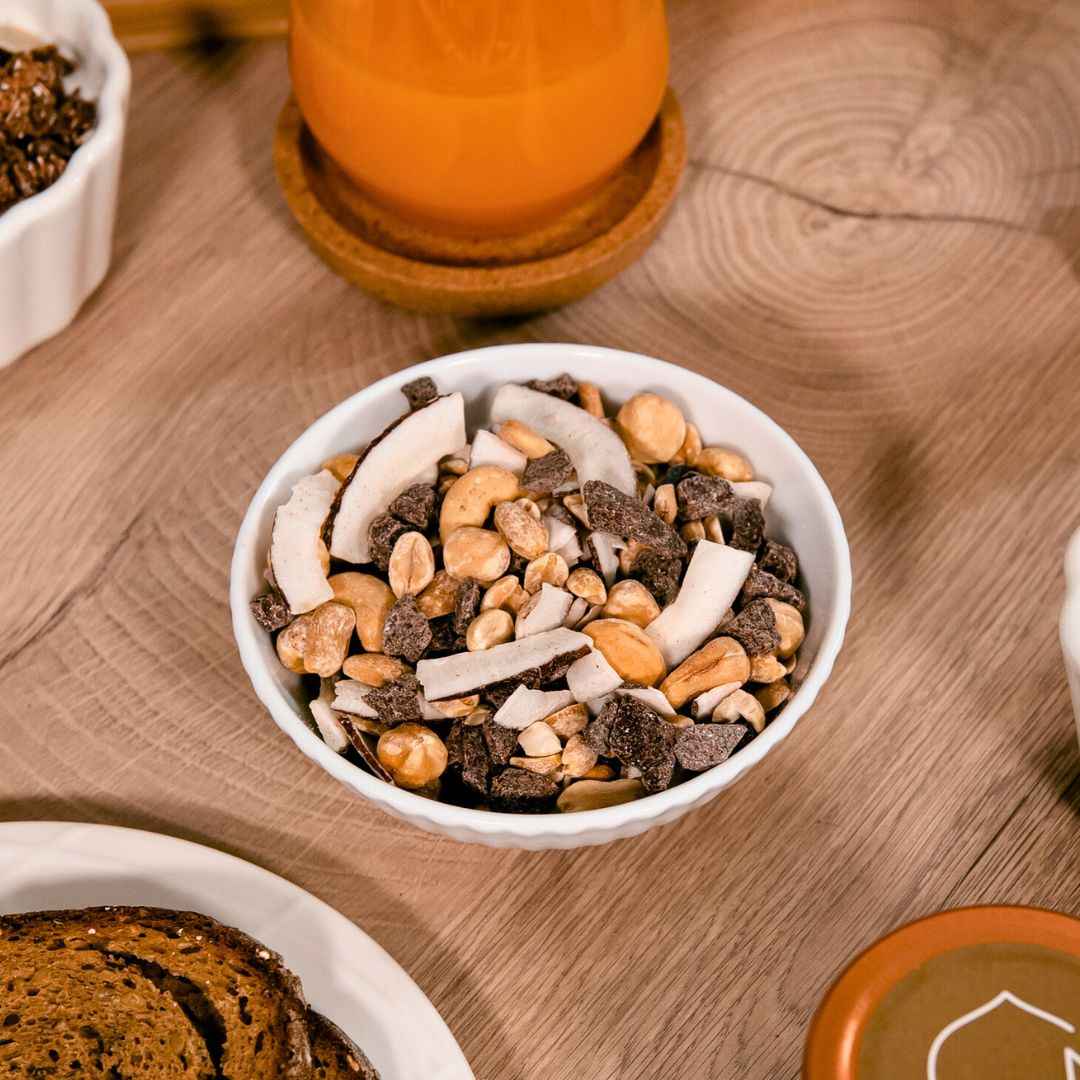 Il cioccolato fondente è un inguaribile seduttore, colpisce con il suo charme a partire dall’olfatto, per esprimersi al suo massimo quando lo gusti. Il nostro è un prodotto artigianale pregiato, proveniente direttamente da Modica, città che di cioccolato ne sa qualcosa. Le Scaglie da “Cioccolato di Modica IGP” Fondenti al 70% rendono questo mix speciale e si combinano alla perfezione con gli altri componenti del gruppo: il Cocco dona un tocco esotico di energia, Anacardi e Noci portano un benefico effetto crunchy ed il Mirtillo contribuisce con una rinfrescante nota dolce e fruttata. Con l’inconfondibile gusto del cioccolato questo mix si farà valere a colazione o come spuntino per allietare pause lavoro, momenti di relax e post workout.