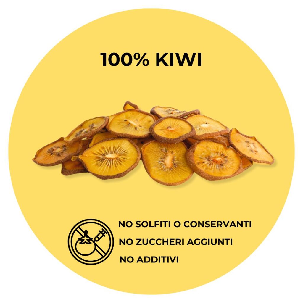 Le fettine di kiwi giallo essiccato sono uniche nel loro genere: sottilissime, rotonde e simili a chips croccanti. Il sapore, poi, ti conquisterà: la sua dolcezza naturale bilanciata da un piacevole tocco acidulo rende ogni morso un’esperienza sorprendente.