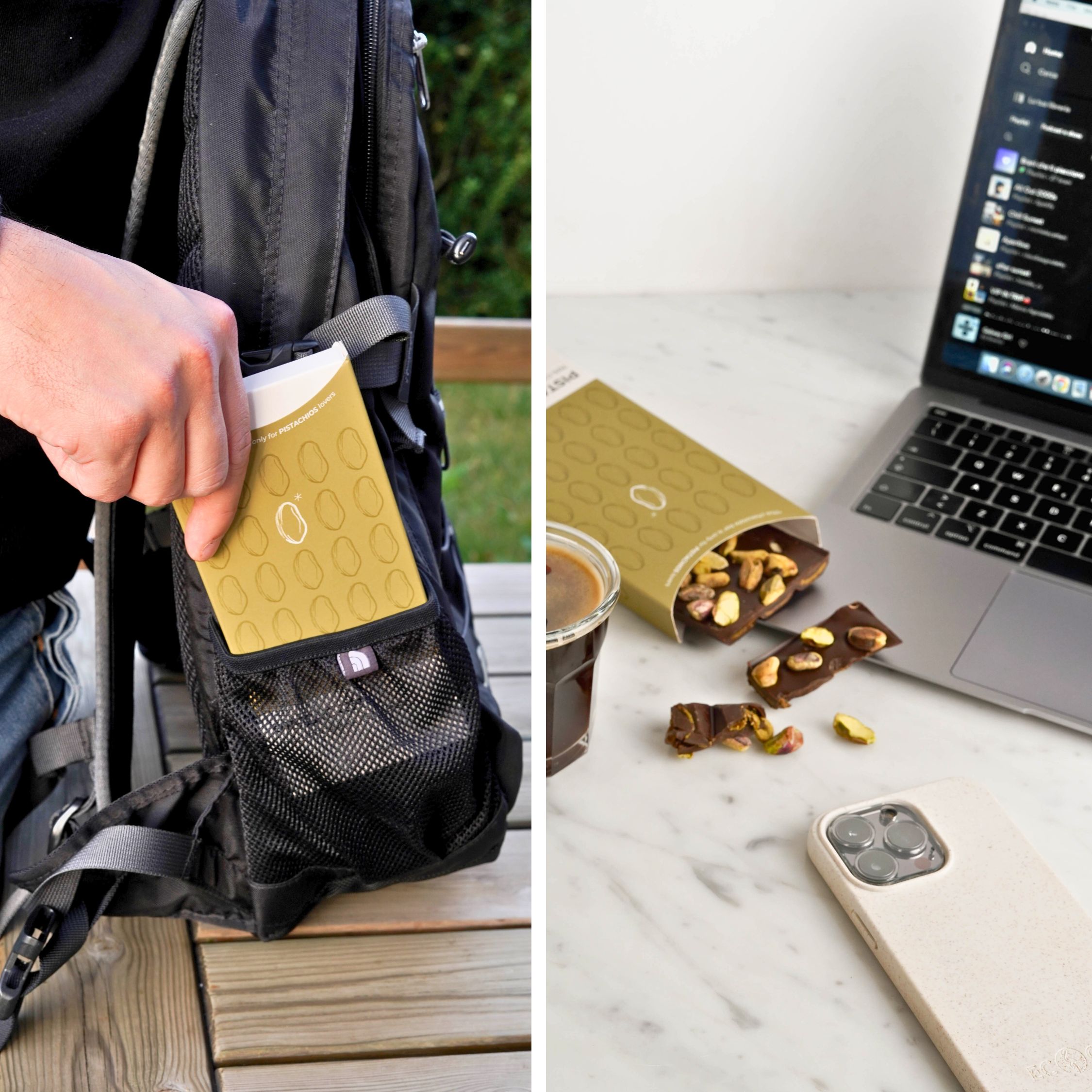 Abbiamo scelto attentamente gli ingredienti che compongono questa tavoletta: dal Cacao Belga Callebaut, ai pistacchi finemente tostati makadamia e, infine, la crema 100% pistacchio che da essi ne deriva e che si nasconde all’interno di ogni cubetto. Insomma, esattamente la stessa frutta secca che puoi acquistare sul nostro shop.